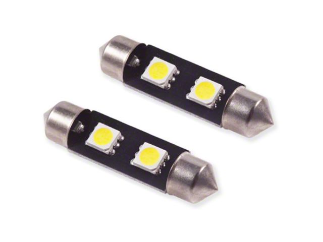 Features Direct replacement for factory 39mm festoon bulb Adds more modern LED appearance Plug and play simple installation Overview Design. The 39mm SMF2 LED bulb is a direct replacement for any 39mm-size bulb commonly found in vanity mirror lights in many vehicles. Populated with two 5050-size SMDs the SMF2 upgrades the factory yellowish incandescent bulb to a more modern LED appearance while adding far more total light output than the factory bulb. The SMF2 was designed with an embedded load resistor and implanted diode for superior reliability. With its durable metal terminals it will fit snugly in the socket and its light weight means it won't vibrate loose over time. Reliability. Unlike other bulbs on the market this bulb is built with constant-current circuitry along with transient suppression. That means this bulb will last for years not months with no flickering or failure. And like every Diode Dynamics product it's backed by an industry-leading three-year replacement warranty. Brightness. With 24 lumens of true measured output the SMF2 LED will provide about double the total light compared to your original 39mm-sized bulb. All Diode Dynamics LED lighting is rated with accurate measured lumen figures not calculations or guesses. We test the true output in-house and provide you the real numbers to compare. Colors. In addition to vibrant colors of blue red amber and green the SMF2 is available in a cool white 6000K and warm white 3000K option as well. Whether you want a modern cool white appearance or a traditional warm white color we have the color to fit your need!