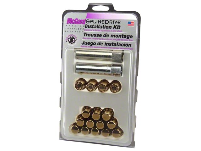 The convenient way to order Tuner wheel locks and lug nuts; contains all the wheel locks and lug nuts that you need to install 4 wheels and tires.; Why settle for ordinary lug nuts? SplineDrive Lug Nuts combine style and performance.; A no-compromise design engineered to fit small diameter recesses in Tuner style wheels.; SplineDrive lug nuts offer closed-end design, maximum gripping power, more stud engagement and a greater seating surface than socket style lug nuts.; In addition they are 30% lighter in weight.; Like all McGard lug nuts, the chrome with gold PVD plating is guaranteed for life not to rust, chip or peel.; The easy-to-use, one-piece wheel locks function like regular lug nuts, but require a special key tool for installation and removal.; The computer generated key designs allow for an infinite number of key patterns.; McGard manufactures wheel locks and lug nuts in the USA to meet or exceed O.E.M.; standards for safety and durability.; Every lug nut and wheel lock is fully machined from restricted chemistry steel made specifically for McGard and through-hardened for its unsurpassed level of safety.; For use on aluminum cone seat wheels only.; Clamshell packaging.; This product may contain globally sourced materials/components.