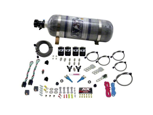 Want more horsepower without the hassle and expense of going direct port? Then the NX dual stage nitrous systems are the way to go. Having two stages means you double your power options at the click of a switch. The dual Shark nozzles give adjustability from 50 to 300 wheel horsepower in 25hp increments. Systems come complete you're your choice of 5lb, 10lb, 15lb, or 10lb composite nitrous bottle, stainless bottle bracket, Lightning solenoids, extra long stainless braided N2O line, and all necessary hardware to complete the installation