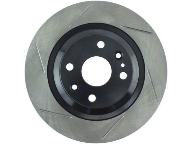 StopTech Slotted Sport Rotors are 1-piece direct replacement brake discs for factory brake systems and stock calipers that look great behind your wheels and offer significantly improved braking performance. The unique slotting aids with heat and brake dust dispersal; prevents glazing of the pads; adds bite and improves wet and dry braking performance. Built to last; the black e-coating provides protection from corrosion and the high carbon metallurgy (in most applications) offers quieter operation; better crack resistance and increased performance.