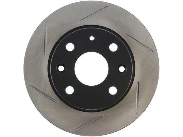 StopTech Slotted Sport Rotors are 1-piece direct replacement brake discs for factory brake systems and stock calipers that look great behind your wheels and offer significantly improved braking performance. The unique slotting aids with heat and brake dust dispersal; prevents glazing of the pads; adds bite and improves wet and dry braking performance. Built to last; the black e-coating provides protection from corrosion and the high carbon metallurgy (in most applications) offers quieter operation; better crack resistance and increased performance.