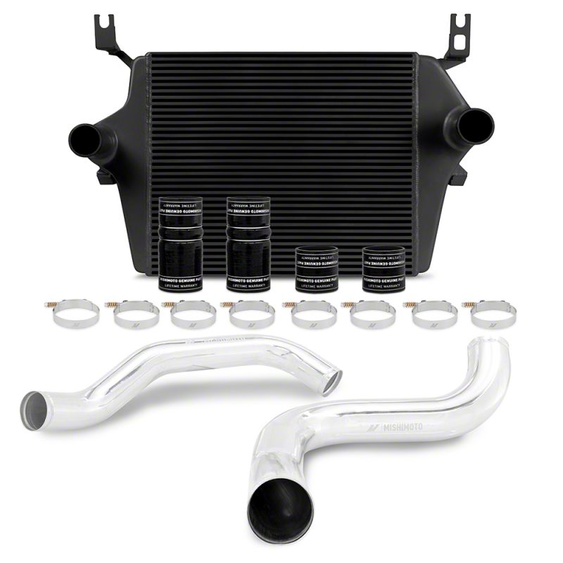 Add some cooling power to your 1999-2003 Ford F-Series 7.3L Powerstroke with the Mishimoto Performance Intercooler Kit. This kit includes everything you need to improve airflow, substantially lower air charge temperatures, reduce EGTs, and support your truck at any power level. The first key component is the Mishimoto intercooler piping. The pipes are constructed of mandrel-bent aluminum with the options of polished or wrinkle-black powder-coated finishes. This kit includes Mishimoto silicone boots with DuraCore technology and constant-tension T-bolt clamps for accurate and consistent holding power. Mishimoto DuraCore technology is the synthetic material that comprises the innermost layer of all Mishimoto silicone diesel boots. Compared to regular silicone, DuraCore provides superior resistance to heat, pressure, fuel, and oil. This effectively increases the life of our boots by preventing leaks and blowouts. This package is rounded out with the Mishimoto intercooler, featuring a significant increase in core volume, extremely durable cast aluminum end tanks, and a robust bar-and-plate core, all designed to provide cool, dense air to your engine. The application-specific DuraCore bootkit design allows for the installation of our performance bar-and-plate intercooler typically reserved for the 6.0L Powerstroke. The larger and more robust design is ideal for high-horsepower applications, with boost levels pushing well over the stock limits, and for use in the harshest conditions. Our kit also includes all necessary hardware for a secure installation of the intercooler to round out the conversion. Our intercooler design reduces pressure drop while cooling charged air, resulting in overall increased engine efficiency. All the components in this kit are engineered to last, just like your truck. Offered with either a black or silver core, the Mishimoto 7.3L Powerstroke intercooler kit is protected by our signature lifetime warranty.