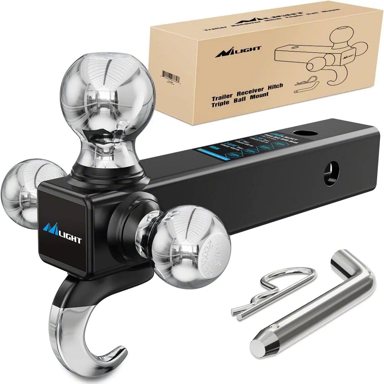 2.Product Dimensions: This trailer hitchball mount comes with a 2-inch x 2-inch shank to fit virtually anyindustry-standard 2-inch receiver. Triple ball mount with three hitch ballsizes with hook, including 1-7/8”, 2” and 2-5/16”
