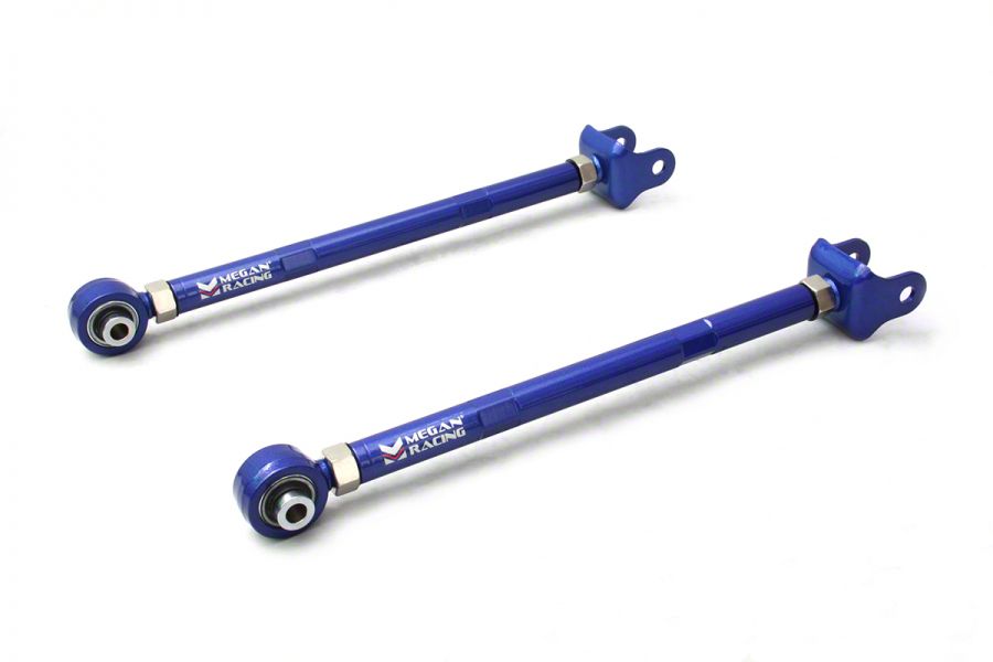 For those who utilize an aftermarket Coil-Over system that REMOVES THE USE OF THE OEM SPRING PERCH, Megan Racing has developed an adjustable rear lower control arm that replaces the large heavy aluminum spring perch and its soft bushings and replaced them with a powder-coated steel arm that has length adjustment and pillow-ball ends to remove any play in the suspension. The Powder-coated Steel Construction also adds for durability and wear against demanding competitive conditions and rough driving surfaces as well.