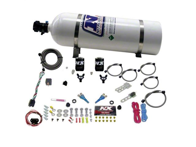 Nitrous Express has combined performance, quality and easy installation in this new nitrous system engineered specifically for Nissans and Infinities. This system includes an Autolearn TPS switch which allows the nitrous to activate only at wide open throttle. A direct-plug-in Fuel Line Adapter is provided to simplify installation (no need to cut your factory fuel lines). The system also includes Lightning series fuel and nitrous solenoids, two Shark nozzles, two nozzle adapters, 15lb nitrous bottle with the new lightning 45 bottle valve, extra long stainless braided N2O line, stainless bottle brackets, master arming switch, relay, relay harness and all necessary hardware to complete the installation. Includes jetting for 35, 70, 100 and 150HP. With additional jets, this system can produce up to 300 wheel horsepower! Fits late model Nissans and Infinities including 350Z, 370Z, G35 and G37s.