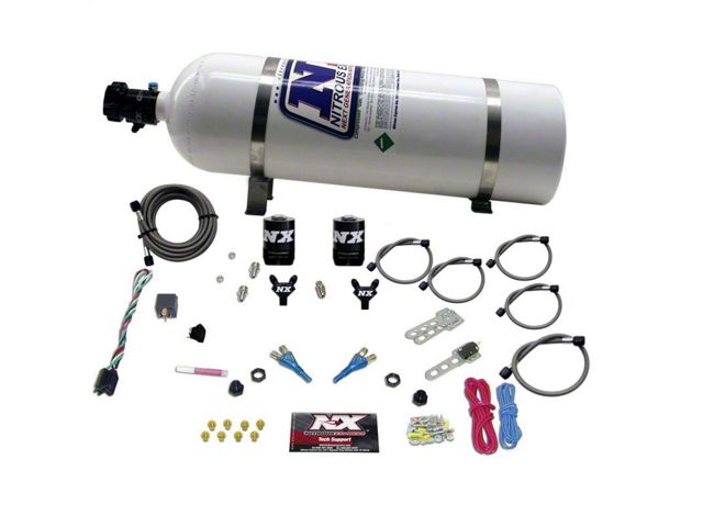 Want more horsepower without the hassle and expense of going direct port? Then the NX dual stage nitrous systems are the way to go. Having two stages means you double your power options at the click of a switch. The dual Shark nozzles give adjustability from 50 to 300 wheel horsepower in 25hp increments. Systems come complete you're your choice of 5lb, 10lb, 15lb, or 10lb composite nitrous bottle, stainless bottle bracket, Lightning solenoids, extra long stainless braided N2O line, and all necessary hardware to complete the installation.