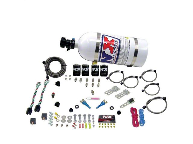 Want more horsepower without the hassle and expense of going direct port? Then the NX dual stage nitrous systems are the way to go. Having two stages means you double your power options at the click of a switch. The dual Shark nozzles give adjustability from 50 to 300 wheel horsepower in 25hp increments. Systems come complete with stainless bottle bracket, Lightning solenoids, extra long stainless braided N2O line, and all necessary hardware to complete the installation. Some systems include a 5lb, 10lb, 10lb composite or 15lb. nitrous bottle
