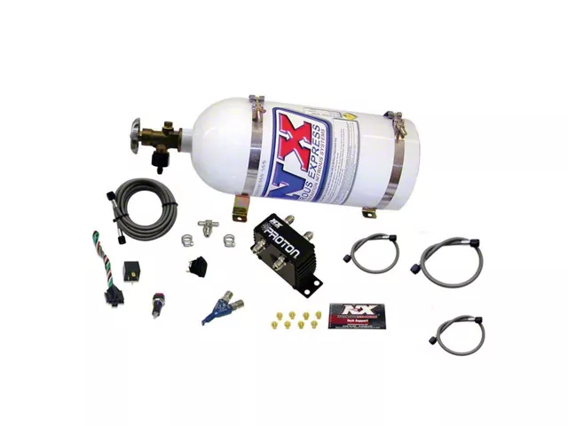 Proton Series nitrous systems combine performance, durability and value in a compact and easy to mount module. Proton systems contain high quality, made in the USA, solenoids that are capable of producing 150 horsepower to the wheels. The black anodized aluminum housing not only looks great, it pulls heat away from the solenoids for extreme durability. This Proton system includes jetting for 35HP, 50HP and 75HP. This system also includes a 10lb nitrous bottle with a chrome high flow bottle valve, stainless bottle brackets, a single Piranha nozzle, stainless braided nozzle lines, extra long braided stainless feed line, master arming switch and a push button. Fits all electronic fuel injected vehicles with a single throttle body.