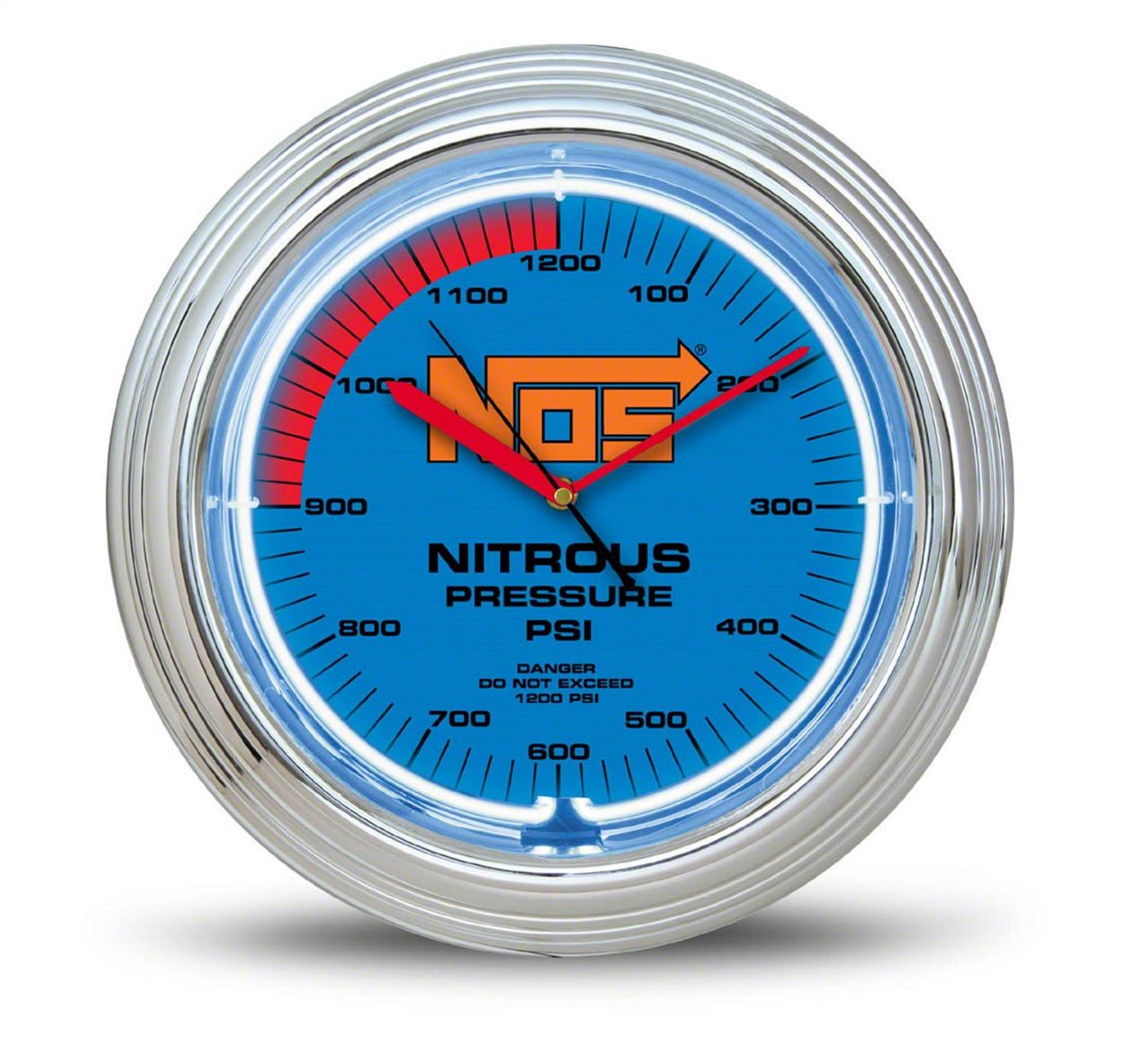Patterned after our Nitrous gauge, this 10 inch clock has 100-1200 display, NOS blue face with blue neon ring, red hands and black second hand. One AA battery required.