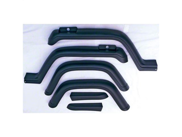 This six piece factory-style replacement fender flare kit from Omix is constructed of virtually indestructible, hard-wearing, UV treated thermoplastic to provide years of service. Each replacement flare is designed to fit into your factory mounting holes (if factory hardware is rusted, some hole modification may be needed). This replacement flare kit fits 87-85 Wrangler YJ models and includes 4 OE style flares, 2 flare extensions and all the necessary mounting hardware.