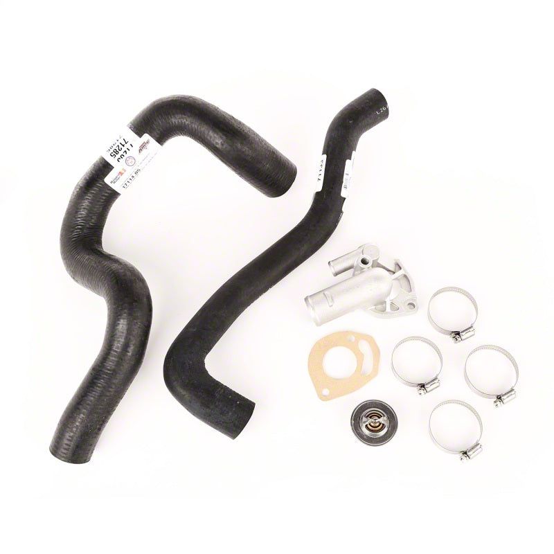 Omix Cooling System Kits offer you the exact parts you need to keep your Jeeps cooling system operating at its best. When you are ready to service your cooling system, just drain the old coolant, install the components in our Cooling System Kit and refill the system. Since all of our parts are engineered to meet or exceed OE quality standards, you'll be running cooler knowing that you did the job right. Each kit includes the correct NEW upper and lower radiator hoses, NEW thermostat housing, 195 degree thermostat, gasket and four radiator hose clamps.