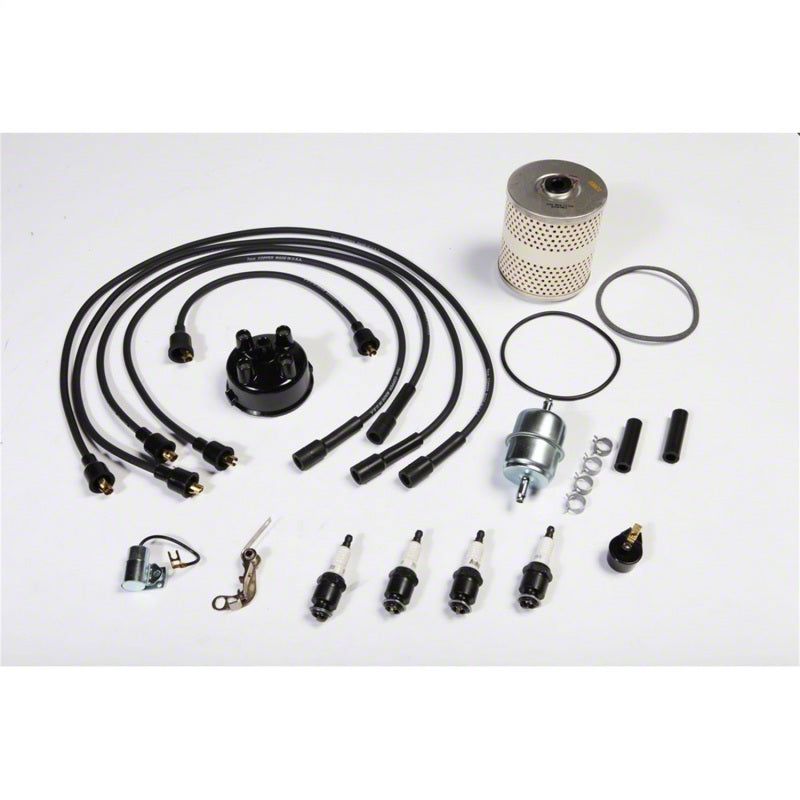 If your Jeep is not running as smooth as it once did, it may be time for a tune-up! Omix has all the necessary high-quality parts to restore the performance to your engine- parts built to meet or exceed factory standards. This ignition tune-up kit fits 55-66 CJ5/CJ6 and 53-67 CJ3B models with 134 ci engine and includes new oil filter, fuel filter kit, ignition wire set, spark plug set, distributor cap, rotor, points and condenser.
