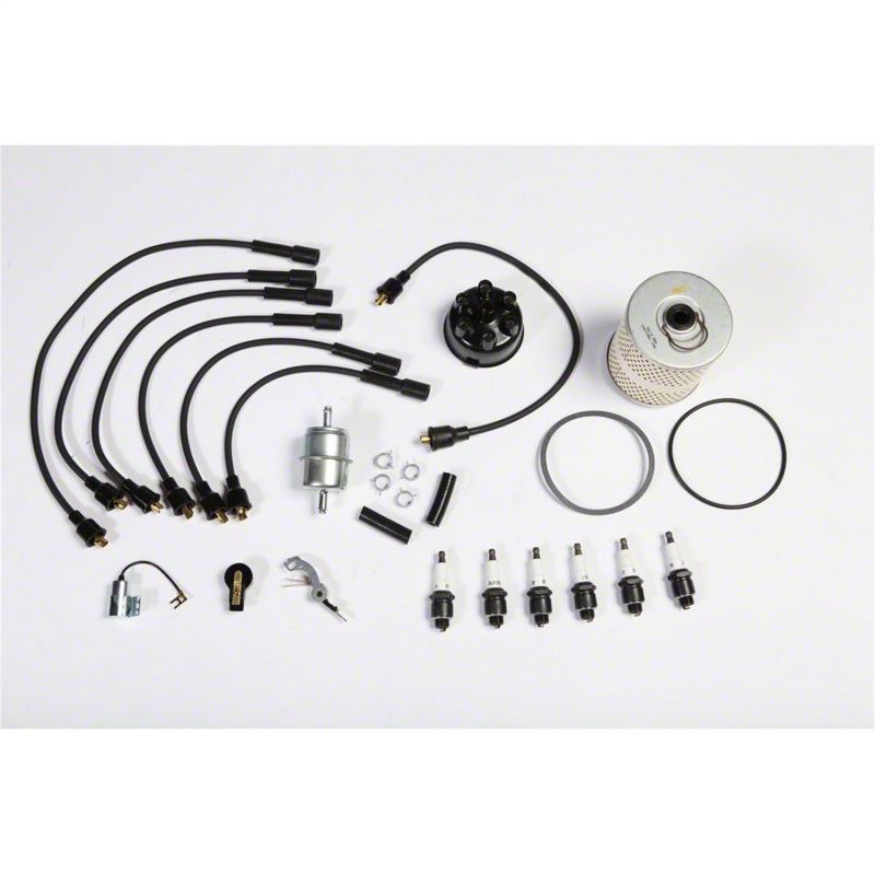 If your Jeep is not running as smooth as it once did, it may be time for a tune-up! Omix has all the necessary high-quality parts to restore the performance to your engine- parts built to meet or exceed factory standards. This ignition tune-up kit fits 54-64 Truck & Station Wagon models with 226 ci engine and a canister-style oil filter. Kit includes new oil filter, fuel filter kit, ignition wire set, spark plug set, distributor cap, rotor, points and condenser