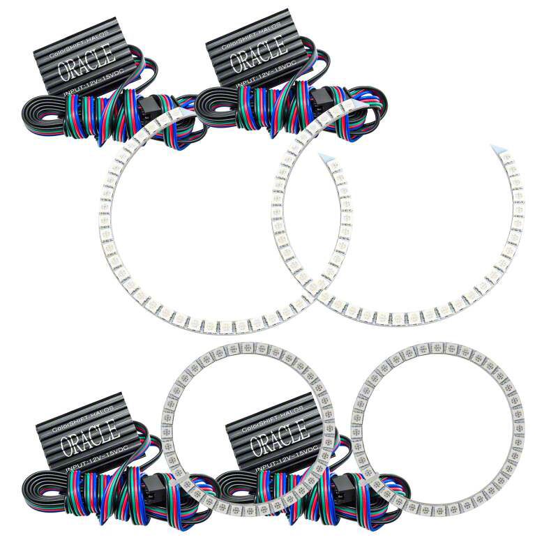 The ColorSHIFT Halo Kit can produce any color including whites from 3000K-15000K with the push of a button. This allows the user to dial-in the exact color rings that they desire. These 3-Chip 5050 SMD rings are BRIGHT, and for some they may be too bright, that is why (for the first time) the user has full control over the ring brightness. ORACLE SMD or "Surface Mount Diode" Halos utilize an advanced type of LED chip that can produce brilliant light output while only consuming a small amount of power. The SMD chips are installed onto a CAD designed 6-layer PCB (Printed Circuit Board) which is very sturdy and will not break if pressured. The PCB can easily be mounted to a headlight housing using the pre-installed 3M adhesive tape backing.