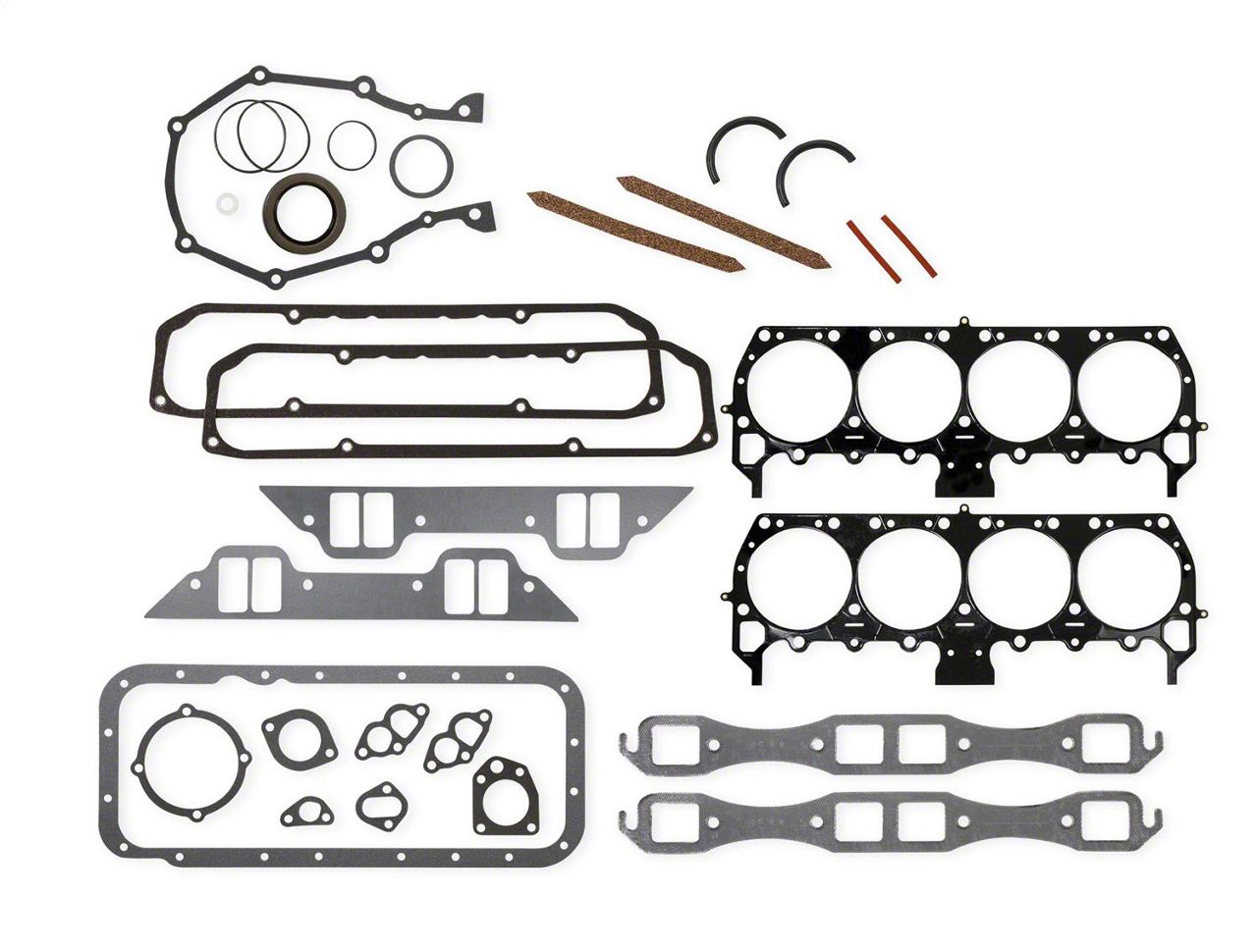 Kits include all gaskets needed for a complete engine overhaul. Cylinder head, intake, exhaust, valve cover and oil pan. Distributor gasket (where applicable), timing cover, fuel pump, thermostat, water pump, and rear main seal. For OE replacement, high performance street, drag race and oval track.