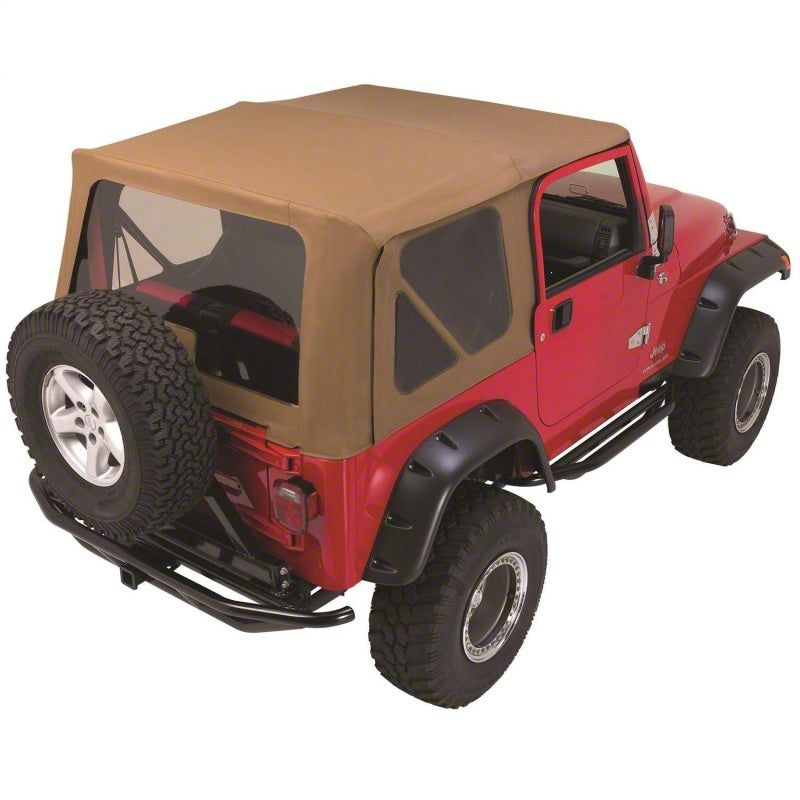 The TJ Complete Soft Top includes factory-grade fabric top, full frame, hardware, bows, soft top storage bag, tailgate tonneau and soft upper doors. It comes with easy to follow instructions and is packaged in a convenient, durable canvas storage bag. For half door applications only.