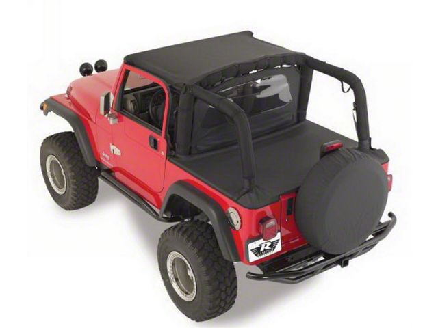 Rear Tonneau Cover protects the back storage compartment from the elements and prying eyes. Installation to factory belt rail system and rear tailgate bar. Also, a front attachment to the cab rear window panel with a heavy-duty zipper that includes a velcro flap cover to fully seal the rear compartment. Sleek looking tight fit eliminates flapping in the breeze. Constructed from a durable soft top material and custom sleeve seals around the roll bar. Also comes wiht factory soft top and channel mount.