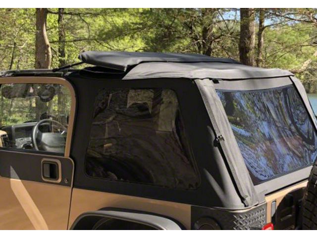 The Rampage Frameless Trail Top installs over the original equipment factory roll bar for a snug fit. This unique design allows for larger side windows and improved visibility with removable side and rear windows that quickly convert the soft top into an open Safari top. Windows use heavy duty molded tooth zippers and are easily replaced or removed. The windows are also stored in a special separation panel between the ceiling and roof top which is concealed to protect the windows from scratches or puncture. The fastback style offers improved aerodynamics and a quieter ride than factory bow style tops. The windshield channel, door surrounds and tail gate bar are required. These can be purchased separately.