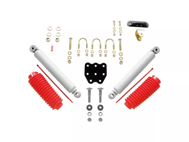 Designed to reduce wheel shimmy and end vibration caused by larger tires, the Rancho steering stabilizer kit cuts down on steering arm fatigue to improve handling. The kit includes two Rancho RS5000 steering stabilizers and installation brackets.