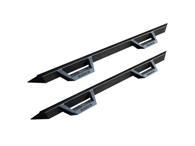 Magnum RT Steps give your truck a unique and rugged look. The Magnum RT side steps feature a sharp drop-down angled step design with a wide step area for easy entry and exiting of your truck. The side steps have a non-slip diamond tread pattern that allows drainage so that water, snow, or mud does not collect. The Magnum RT side steps fit to your vehicle's lower rocker, protecting from road grime or debris on or off the street. Made from 10 gauge steel and finished with a 3 stage black powder coating system. Quality guaranteed with a limited lifetime manufacturer warranty on the workmanship/structure and a 1 year limited manufacturer warranty on the black powder coated finish.