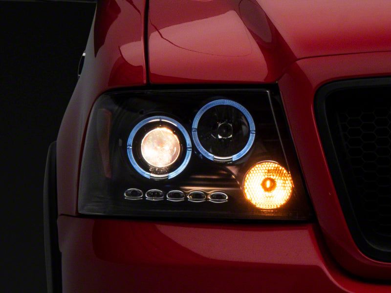 Replace the cracked or cloudy stock headlights on your Ford F-150 with these Black Dual Halo Projector Headlights. With LED halos, LED accent lighting, and amber reflectors, these visually stunning Projector Headlights will provide better visibility and a much safer driving experience. These black Dual Halo Projector Headlights are furnished with projector lenses that work in conjunction with the powerful bulbs to produce a sharp, focused light beam that allows you to see the road ahead with ease. The integrated LED halo and lighting accents will help to make your F-150 much more noticeable to distracted drivers. With this set, you will get the added safety you need and the style you want. Engineered to precise standards from high-quality materials, these Projector Headlights feature bold black housings with durable clear polycarbonate lenses and modern LED accent lighting. Each assembly is sealed to prevent dirt, water, and moisture intrusion from damaging the premium electronics. These lights are DOT-approved, which means that they are street legal and comply with the transportation law. They also meet the automotive standards for the manufacturing, testing, and design of lightings set forth by the SAE. Made with OEM standards, these Projector Headlights are designed as a direct fit replacement for the factory units. The installation completes with light mechanical and electrical skills required.