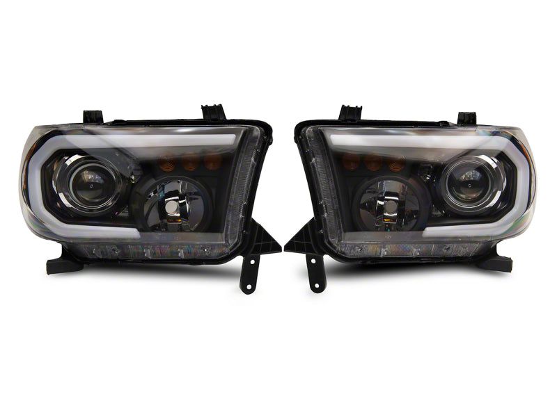 Add an updated contemporary appearance to your 2007-2013 Toyota Tundra, all while improving your nighttime visibility with a pair of Axial Projector Headlights that feature black housings and clear lenses. With an impressive LED Daytime Running Light (DRL) design, that double as sequential turn signals, these Axial Headlights will give your Tundra a whole new look. Utilizing a projector lens design, these Headlights will light up the road ahead with a bright focused beam for better nighttime visibility. The white Daytime Running Light (DRL) Bar accents not only look great, but will also ensure that you are visible to distracted drivers day or night. Manufactured from OEM grade materials, these Projector Headlights are assembled to precise standards for long-lasting quality. These Projector Headlights feature durable, black ABS plastic housings with crystal clear polycarbonate lenses and modern LED lighting. Each housing is weather-sealed to prevent dirt and moisture from harming the state of the art electronics found inside. These Headlights were designed to be a direct plug and play replacement for your vehicle's original factory housings. The DRL light bar portion of the headlight will require splicing into your running lights for operation. Please be sure to have your headlights properly aimed/aligned before driving at night.