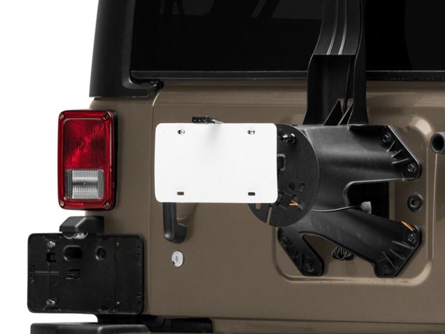 This License Plate Bracket allows you to mount your license plate safely within your spare tire away from trail hazards that could otherwise damage it. While the included LED light doubles as a license plate light and as an extra brake light. Constructed from steel for superior strength, this License Plate Bracket is completed in a textured black powder coated finish for aggressive good looks and long lasting corrosion resistance.