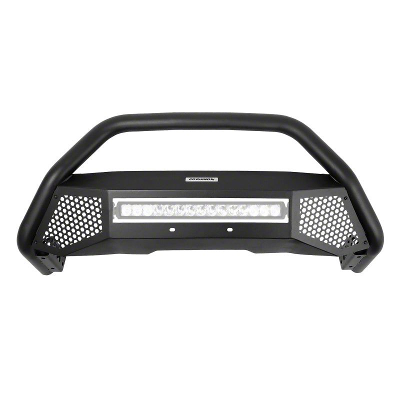 Go Rhino's RC4 LR Bull Bar is a modern, sportier take on classic truck front protection. The 2.5" diameter tubular steel frame features a steel skid plate with a stylish hexagonal cut out patter, a slot for a 20" single row LED light bar, and pre-drilled holes along the center crossmember for additional auxiliary lighting. RC4 LR Frame comes with a Limited Lifetime warranty on materials and construction and a 5 year warranty on the Textured Black Finish.