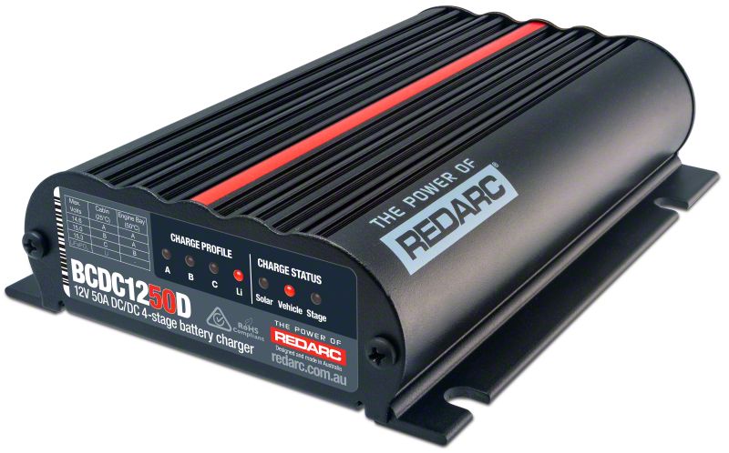 The REDARC BCDC1250D is a 12V, 50A In-vehicle DC to DC Battery Charger designed to keep your auxiliary battery charged when driving or with portable solar panels when parked. It uses multi-stage DC-DC charging, a system that allows optimum charging levels for your auxiliary battery. The BCDC1250D has been developed to provide a higher current output, it features an additional charging stage known as SoftStart which has been engineered so that it can handle more demanding applications. Featuring a Maximum Power Point Tracking (MPPT) solar regulator, the BCDC1250D will charge from both solar and the alternator simultaneously. And, with built-in Green Power Priority it will select solar charging first, meaning less load on the alternator. Suitable for 12 or 24-volt vehicle systems, the unit will also work with either standard or variable/smart alternators. It is compatible with all common types of batteries used in automotive and recreational vehicles such as AGM, Gel, standard lead acid, Calcium and LiFeP04. As a guide, the BCDC1250D is used for battery bank sizes over 200AH. For smaller batteries of 75-200AH, REDARC recommends the BCDC1225D. This DC-DC battery charger with solar input has been proven to work in all types of terrains, including deep water crossings, and stands up against extreme heat (up to 176 deg F). It's fully sealed against the risk of infiltration from water and dust and will hold up to the adventure at hand. It's designed to maximize the performance and life of your auxiliary battery and is suited for battery bank sizes of 200AH and above in most applications. Made in Australia by REDARC this amazing range has undergone years of testing in some of the harshest conditions on the planet. REDARC has been in business for 40 years and all of our products are made tough enough to take anything nature can throw at them.