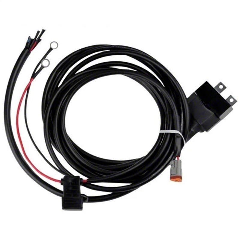 This 13' wiring harness is designed to connect a single 20"-50" E Series Amber/White LED light bar to your 12V electrical system. It features battery terminals on one end and a Deutsch connector on the other to connect to the light. It incorporates an inline fuse holder, a 14V relay, and a waterproof switch.