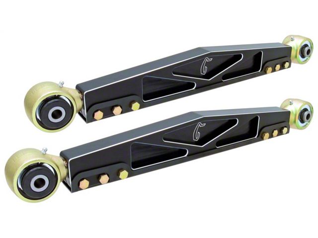 RockJocks high end, billet aluminum Johnny Joint(R) front lower control arms for the 2007-2018 Jeep JK Wrangler are a beautiful addition to any JK build and provide length adjustability allowing pinion angle to be adjusted after the installation of a suspension lift! Arms are constructed of CNC machined billet 6061-T6 aluminum and are finished in black anodizing with machined highlights. 4130 chromoly skid plates bolt on so that they may be replaced in the future if they are damaged. Arms are double adjustable via right hand/left hand 1 1/4 in. thread Johnny Joint(R) rod ends and grade 8 p in. bolts at each end. NOTE: These arms will work with 37s on stock width axles and a 4 1/2 in. backspace wheel. If used with larger tires, you will need to go to a wider axle or wheel spacers. Arms are a minimum of 3/8 in. longer than stock and must be used in conjunction with adjustable upper control arms.