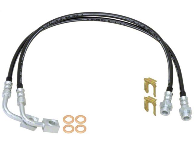 RockJocks D.O.T. approved stainless braided extended rear brake line kit for 2007-2018 Jeep JK Wranglers is used with our 4 1/2 in. lift in when a rear Antirock(R) sway bar kit is being installed - only. If stock rear sway bar is being retained - you will need the CE-9807FBLK line kit. This line kit includes the two 25 1/2 in. long hoses, 4 copper banjo bolt washers, frame tabs, and clips. Sold as a pair.