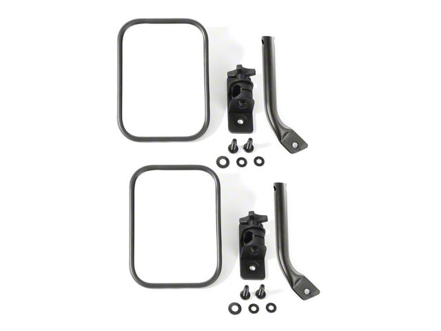 The new Rugged Ridge Stubby Quick Disconnect Mirrors give you the visibility you need for safe driving when you take the doors off your JK, but with a new 'stubby' arm; delivering a narrower, more off-road friendly profile. Each mirror arm is reduced by three inches, allowing the mirror to hug more tightly to the vehicles body. Available with both round and rectangular mirror heads, Rugged Ridge Stubby Mirrors textured black powder coat looks great on any paint color and installs easily with the included mounting hardware. When it's time to put the doors back on, these mirrors can be removed quickly with a few turns of the convenient thumb screw. A convenient bolt-on mirror solution for when you want to leave the doors at home - also great with tube or safari doors. Includes a pair of mirror heads, mirror arms, mounting brackets, bushings, thumbscrews, gaskets and hardware.