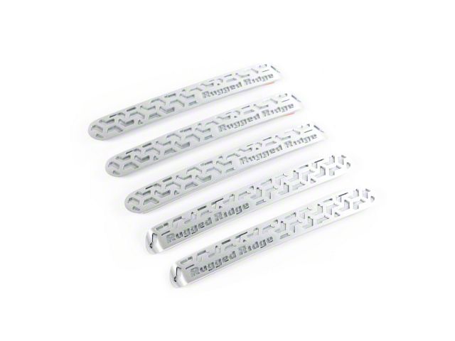 Bring a tasteful off-road accent to your JKU with Rugged Ridge Elite Door Handle Inserts featuring a cool tread-inspired inlay. Each insert is made from lightweight cast aluminum with a lustrous brushed finish giving an eye-catching custom touch to your rig. Kit Includes 5 inserts, for all doors and rear tailgate. These inserts install with ease with double-sided automotive tape. No sharp edges result in a comfort-fitting install.