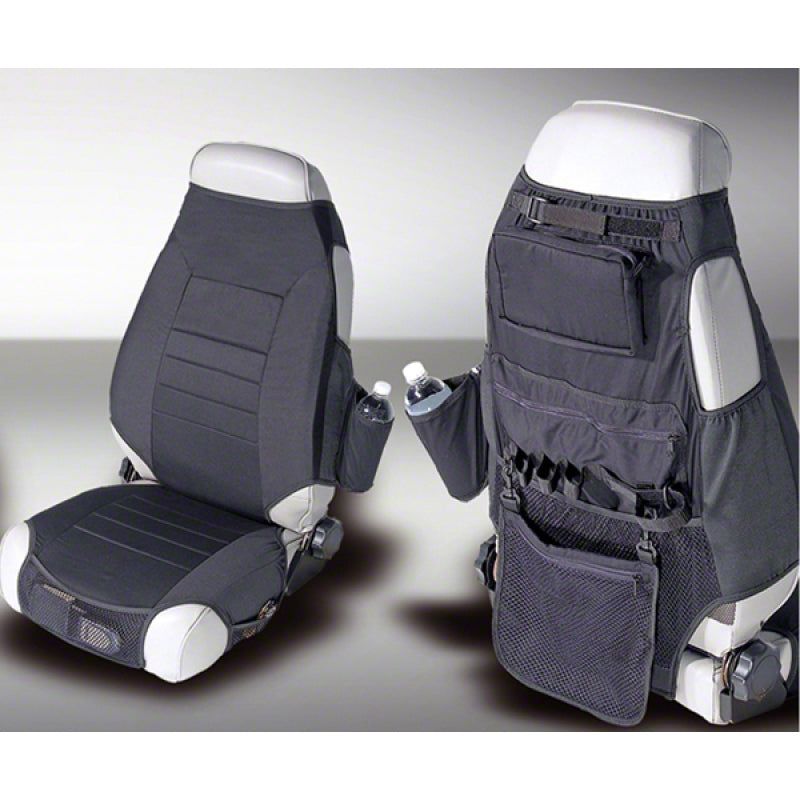 Protect your seats from the elements with these easy to install fabric seat protectors. Constructed of durable UV treated poly cotton fabric to ensure comfort and protection, each seat protector incorporates extra storage on the rear of the cover plus a removable drink holder. Easy to install, these covers fit over all bucket Jeep seats including all Rugged Ridge replacement seats. Sold in pairs to cover your entire front seating area.