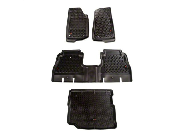 Need an affordable solution to keep the cabin floors of your Jeep looking factory fresh? Try Rugged Ridge's All Terrain Floor Liners! Made of a durable OE-quality thermoplastic material that can withstand the rigor of daily abuse, each liner is perfectly contoured to your vehicle's floor for precise secure fitment (floor hook attachment where applicable). The raised lip captures all spills, water and debris keeping your interior pristine. Features a chevron shape patented deep tread technology. Patent 8,173,369, D627,285