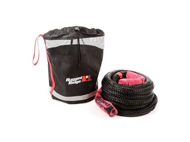 When it comes to preparing your rig for the next off-road adventure, don't forget to pack the essentials. Rugged Ridge Kinetic Recovery Rope is easily one of the most effective products for successful vehicle recovery that you're likely to ever use. The defining difference is in the ropes elasticity, allowing it to stretch slightly, giving the pulling vehicle a growing momentum before transferring the pulling energy to the stuck vehicle, attempts that result in the pulling vehicle breaking traction against the resistance of both vehicles and becoming immobilized, as well. Kinetic Rope allows for a smooth, gradual transition of load and a 30,000 lbs. breaking strength for convincing pulling power in even the most unstable terrain. Rugged Ridge Kinetic Ropes are 30 feet overall length to accommodate a wide array of recovery scenarios and come with a convenient and rugged c in.-style storage bag.