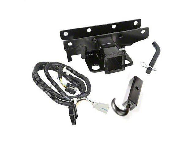 This receiver hitch kit from Rugged Ridge includes a durable powder-coated 2- in. receiver hitch, wiring harness, hitch pin, and a heavy duty black powder coated receiver tow hook that is secured to the receiver hitch-- offering a sturdy attachment point for the rear of your Jeep.