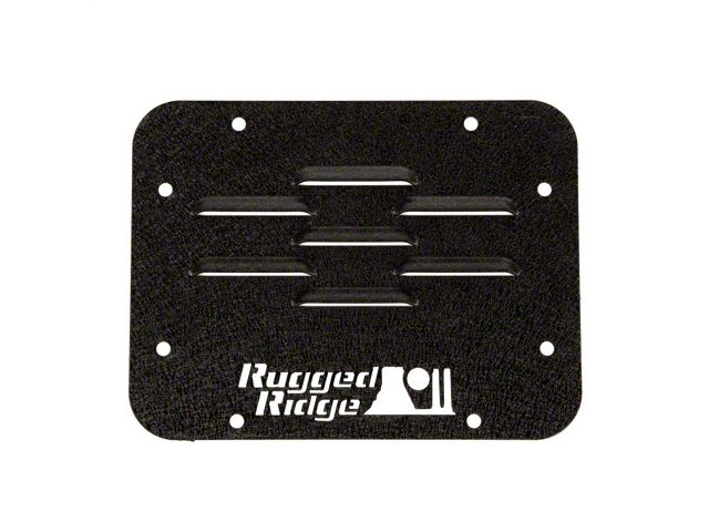 The Rugged Ridge Spare Tire Delete Plate eliminates the factory spare tire carrier on 2007-2018 Wrangler JK models for reduced weight, greater rear visibility and improved departure angles when off-road driving. Stamped from brawny steel plate, precisely drilled to match the JK tailgate and given a black textured powder coat, each Spare Tire Delete Plate is engineered to look like a factory-quality part in both fit and finish. With seven pressed vent louvers and an eye-catching cutout logo, the Rugged Ridge Spare Tire Delete Plate is a serious styling upgrade for anyone who prefers the hardcore off-road image or simply runs a tire too large for conventional carry. The Rugged Ridge Tire carrier Delete Plate is also available in a complete kit that includes both a low-profile license plate bracket and high-mount brake light relocation bracket for a total tailgate makeover.
