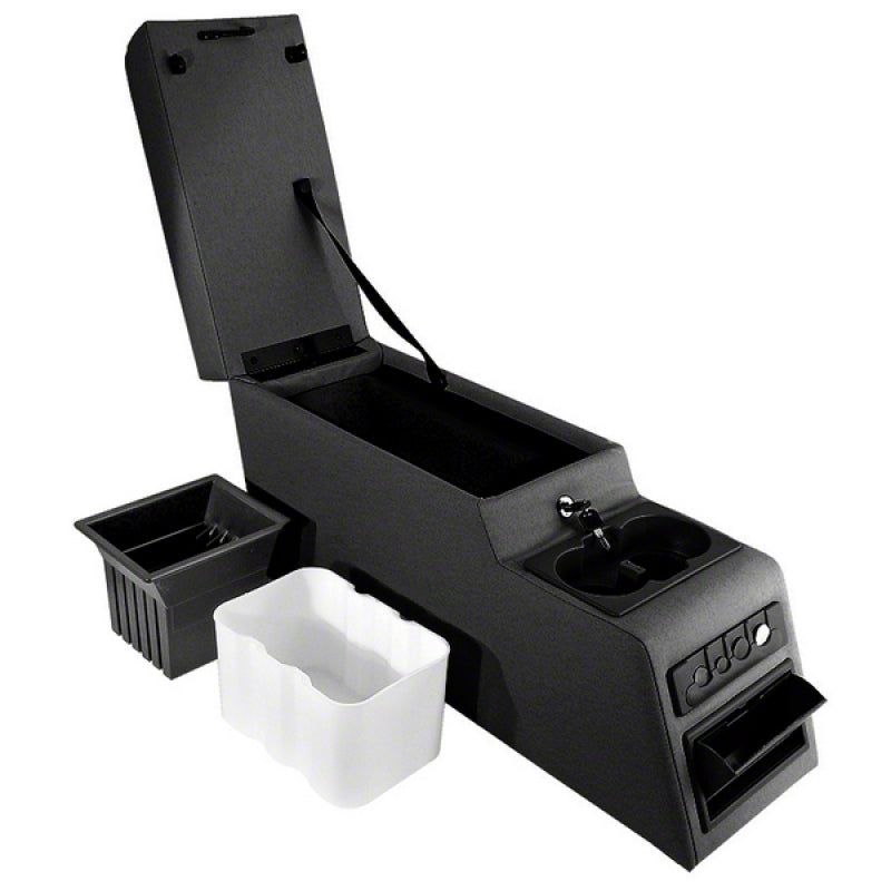This black denim ultimate locking console from Rugged Ridge is the best in storage solutions. Each console is constructed of a strong vinyl wrapped around plastic coated hard wood to keep moisture out and provide a matching and great looking addition to your Jeep's interior. Each console is hand made to ensure a tight, wrinkle free finish. All Rugged Ridge consoles feature a six can cooler, a comfortable dense foam arm rest, and all necessary mounting hardware for your convenience.