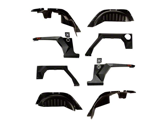 Rugged Ridge Armor Fenders for Wrangler JK are not just another bolt-on accessory. We developed our Armor Fenders with such a brawny/bold styling; they're capable of transforming your rig into an unmistakable, attention-grabbing shadow if its former self. High body lines and aggressively arched wheel openings provide greater clearance for larger tires and allow for improved wheel travel and articulation off-road. Each fender is constructed of heavy gauge 3 mm thick steel, utilizing fold-and-weld construction, for greater structural integrity you can appreciate. Each section is meticulously finished with a resilient black textured powder coat that protects from real-world road hazards. The rear Armor fenders revolutionary 2-piece design allows for full encasing of the taillight and allows for a fitment that is free of gaps for tight fitment and unsurpassed protection while the front Armor fenders integrated vent screen helps expel engine heat for better overall performance. Installation is simplified with the addition of our Gen 2 Inner Fender Liners so there's no need to modify your factory parts in the process. Armor fenders work with all factory components as well as Rugged Ridge Spartan Grill, Aluminum Hood Catches and even Rubicon Rock Rails. Includes marker light assemblies, hardware and complete installation instructions. Patent Pending.