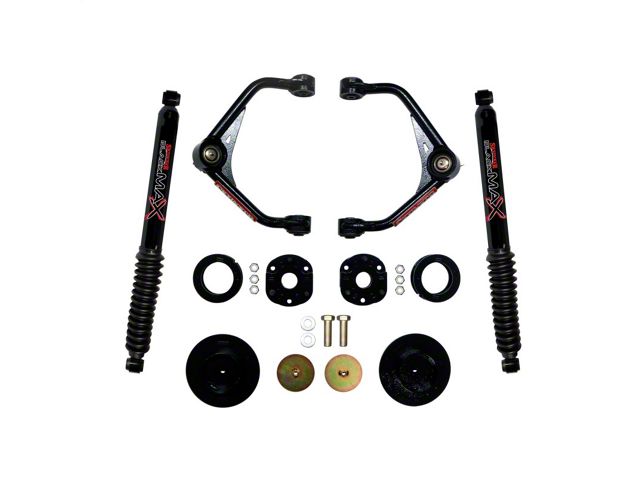 Skyjacker 3 in. A-Arm kit includes everything required for a 100% bolt on installation & includes value added extras! Skyjacker A-Arms are made of high strength DOM (Drawn Over Mandrel) tubing to withstand extreme stresses & loads with an additional 1/4 in. gusset plate stiffener welded in between the A-Arms for added rigidity & strength. The A-Arms are designed to incorporate optimum pivot ball joints to allow for faster & easier alignment and greaseable to increase life & flexibility. Kit features front strut spacers, front differential spacer kit. Includes rear blocks & 2 rear Skyjacker shocks.