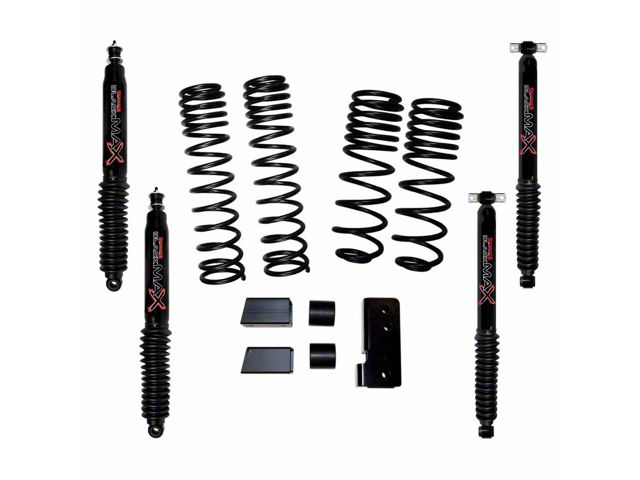 Jeep Wrangler JK 2-Door 2-2.5 in. Dual Rate Long Travel Lift Kit, One Box kit includes Front & Rear Black Max Shocks, Rear Track Bar relocation, Dual Rate Long Travel Coil Springs, Bumpstop relocation. No lower Arms, No Pitman Arm drop required. FMVSS126 Safety Compliant. Dual-rate Long Travel Coils maintain coil in bucket at full droop, Maximizes Articulation, Higher Strength Alloy over competitors prevents sagging fractures and allows for powder coating in the OEM coils for superb ride quality, Individual Rear Spring rates Left & Right side same as OEM.