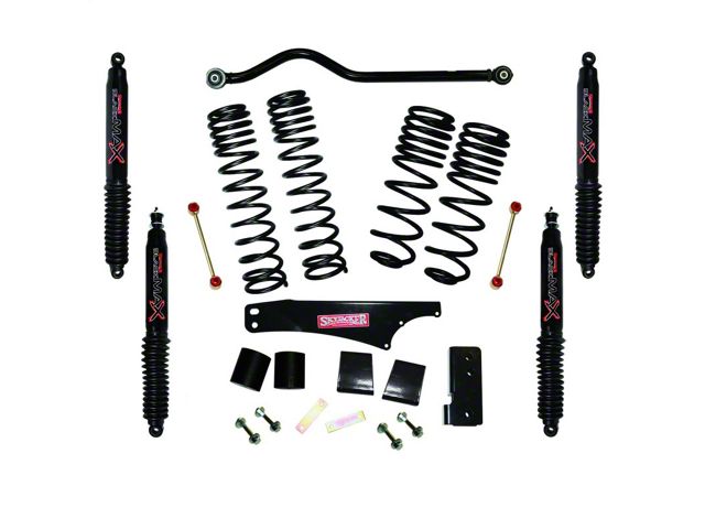 Jeep Wrangler JK 4-Door 3.5-4 in. Dual Rate Long Travel Lift Kit, One Box kit include Front & Rear Black Max Shocks, Adjustable Front Track Bar, Rear Track Bar relocation, Caster Cam Bolts, Softride OEM Spring rate Coil Spring lift, No lower Arms, 'No' Pitman Arm drop required, Bumpstop relocations, Brakeline bracket. FMVSS126 Safety Compliant. Dual-rate Long Travel Coils maintain coil in bucket at full droop, Maximizes Articulation, Higher Strength Alloy over competitors prevents sagging, fractures and allows for powder coating in the OEM coils for superb ride quality, Individual Rear Spring rates Left & Right side same as OEM.