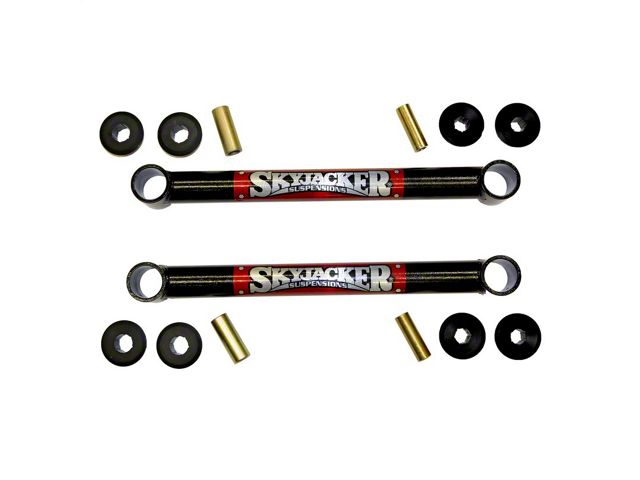 Skyjackers End Links are custom-engineered to drop your sway bar down to the perfect location. Get maximum anti-roll and sway control for better, safer handling on both smooth streets and rough trails. Built using only hard-wearing 4140H steel and finished with a durable zinc coating to block rust, corrosion, and oxidation. New polyurethane bushings included to replace worn factory rubber. These Skyjacker Sway Bar End Links directly replace your stock end links so installation is simple and fast. Minor drilling may be required on some vehicles.