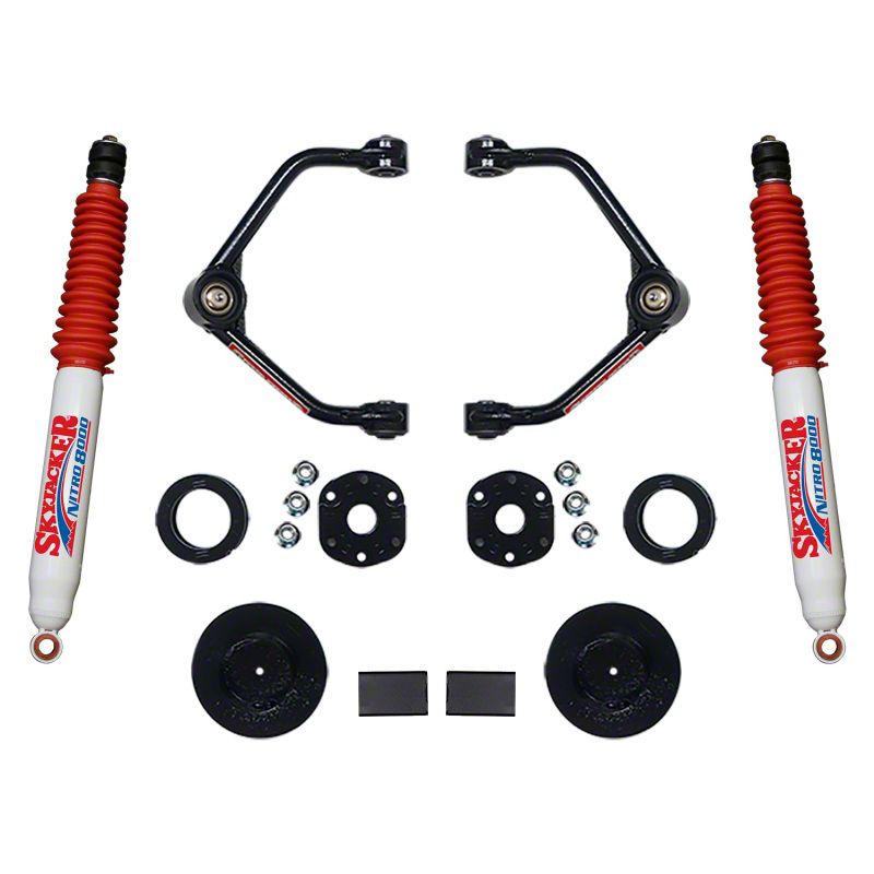 Skyjacker's new 3 In. Upper Control Arm lift kits for the 2019 and up Ram 1500s offer easy installation and an assertive look that provides you with confidence in your Ram 1500. Give your truck the stance and look it wants with Skyjacker's 3 In. Upper Control Arm lift kits. This lift kit comes with a set of Upper Control Arms that are made out of high-strength DOM tubing to withstand extreme amounts of stress and loads, and a gusset plate stiffener is welded in between the Control Arms for added rigidity and strength. You will also optimize and improve the steering geometry and strength of your vehicle with a pair of Skyjacker Upper Control Arms. With the revised steering geometry you get increased suspension travel, and our Upper control arms are manufactured in-house in the USA. Our UCA's include an optimum pivot ball joint for improved flexibility and to reduce stress. The ball joints are greasable to increase service life. You are not only increasing on-road handling but also off-road strength and capability when you choose a set of Skyjacker Upper Control Arms. This lift kit also comes with front strut spacers so you can keep your factory ride and rear coil spring spacers, bump stop spacers, and Nitro 8000 shocks to provide lift and a comfortable ride in the rear of the truck. With this set up you gain enough clearance to run 33 In. tires to gain a clean and assertive look from the front to the rear of this truck. This Skyjacker 3 In. Upper Control Arm lift kit comes with everything you need to give your truck the upper hand. This lift kit is 100% bolt-on, which does not require any cutting, welding, or drilling. This also means you can return to stock at any time if you would like to. Common tools and a home garage is all you need for this lift kit. Comes with Skyjacker's limited lifetime warranty.