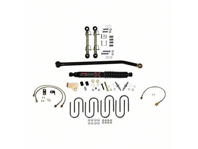 Front Double Disconnect Sway Bar End Links allow full articulation at full droop. Front sway bar end links include Skyjacker installed pressed-in HD OEM style rubber bushings. Front Adjustable Track Bar features a 3/4 in. Teflon(R) self-sealing self-lubricating rod end and mounting bracket with hardware. Replacement Steering Stabilizer allows unrestricted gradual movement but resists sudden shock. Replacement Rear U-Bolts with Mounting Hardware. D.O.T. Certified Extended Length Stainless Steel Braided Brake Lines are for stopping power. (Front pair and single Rear). Complete with all needed Bushings and High-Grade Mounting Hardware. Skyjacker's engineered processes achieve maximum wheel travel, ride quality and long-lasting life. Reap the benefits: On-Road Refinement and Off-Road Readiness.