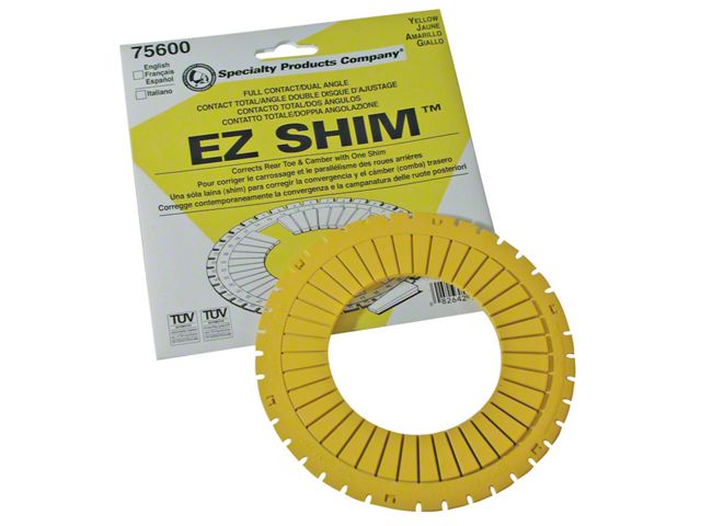 A patented Full Contact Dual Angle Shim, that corrects Toe and Camber with one shim. These two-piece adjustable shims are available in 4 sizes which cover many rear shimable FWD vehicles. Durable construction, proven adjustment changes within .03 degrees toe and .10 degrees camber. CAUTION: Check for caliper to rotor clearance when installing this part on vehicles equipped with rear disc brakes. Some vehicles may require the use of longer bolts. Recommend use of 10408 bolts and 75970 spacers as required. Recommend use of 75915 EZ Shim Cutter. 75910 Dial Chart and EZ shim Online available for setting shims. California Residents WARNING