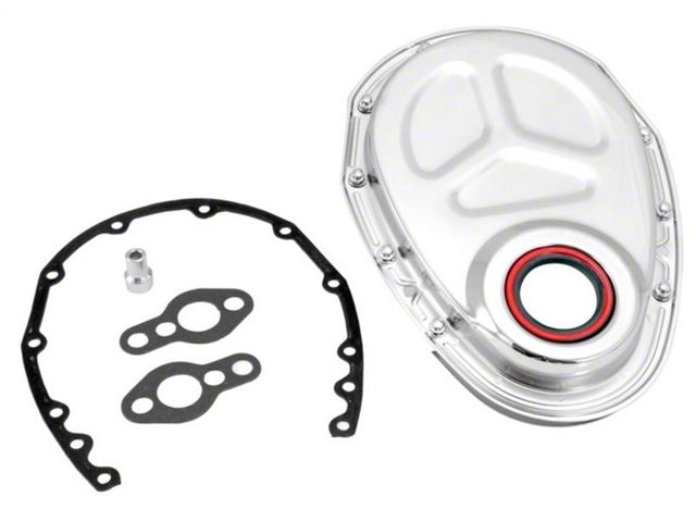 Spectre's Chevy short block timing chain cover kit is designed to protect engine components like timing gears and the timing chain. This kit features a triple chrome plated steel construction and includes a pre-installed seal, base gasket, (10) 12-point screws and a 12 point socket. This timing cover kit is engineered for optimum fit and function and it is designed to fit Chevy 265-400 short block engines.