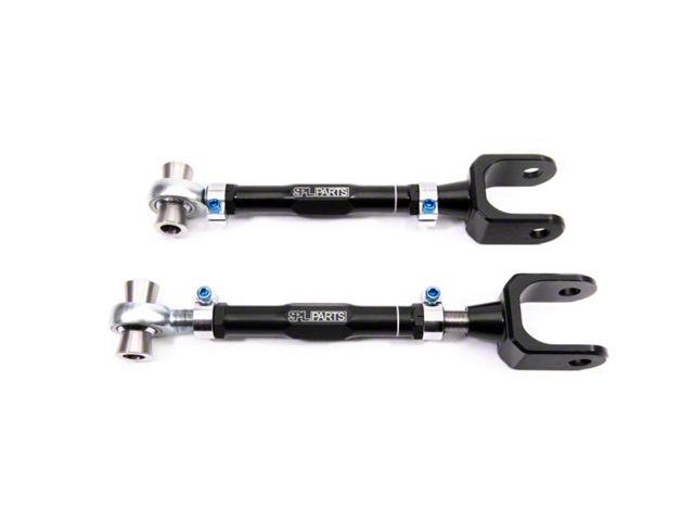 SPL rear toe arms increase stability and response by eliminating bushing deflection while providing an increased range of rear toe adjustment, necessary for lowered cars or for performance alignments. Easily set your desired toe angle by turning the 2024-T351 aluminum turnbuckle and tightening the two 6061-T6 aluminum clamps via titanium 5/16" Allen head cap bolts to lock it down. No more juggling wrenches trying to perfectly tighten down jam nuts! SPL toe arms utilize American made FK rod ends with a self-cleaning, high load capacity bearing within a PTFE-lined race which allows the suspension to freely articulate without significant bushing bind. Sold as a pair, one set needed per vehicle. Made in the USA. NOTE: If you have installed the Ford Performance Bushing in the knuckle in the Toe Arm location, you will need to contact us first to get a part with proper fitment.